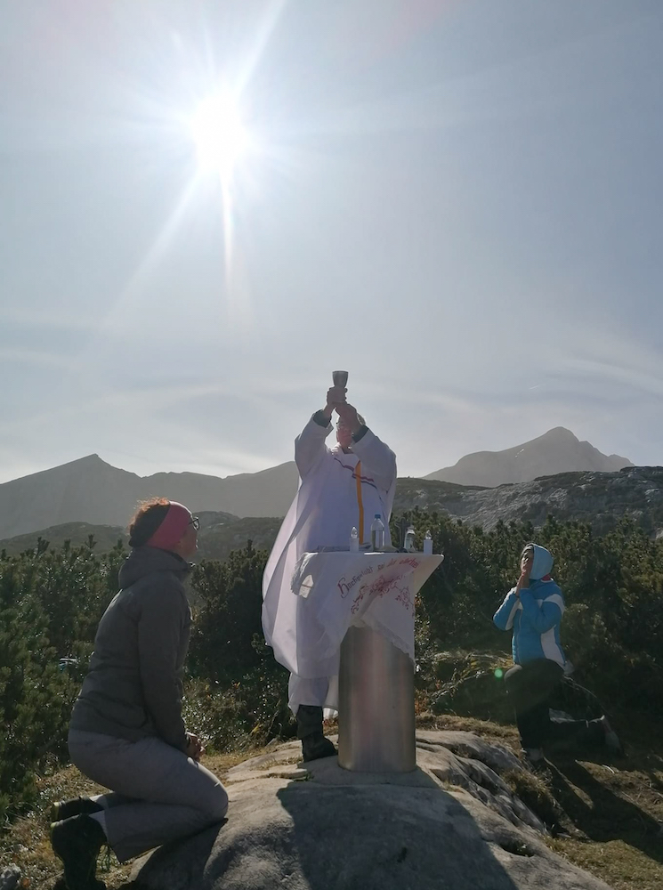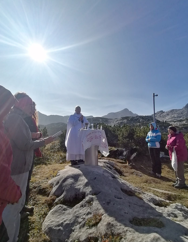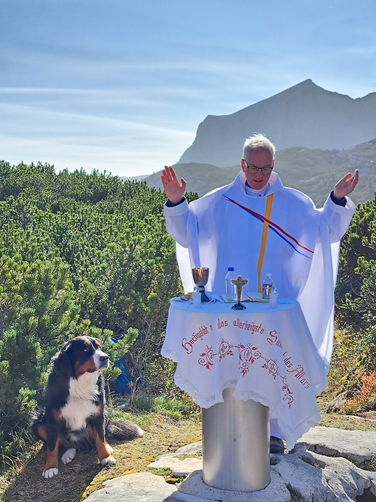 Der Morgen lud zu einem Lobpreis bei Sonnenaufgang ein, an der Eucharistiefeier im Sonnenschein nahm auch ein Sennenhund teil, der sich wie ein Ministrant neben den Altar setzte und so zu einem unvergesslichen Erlebnis beitrug.