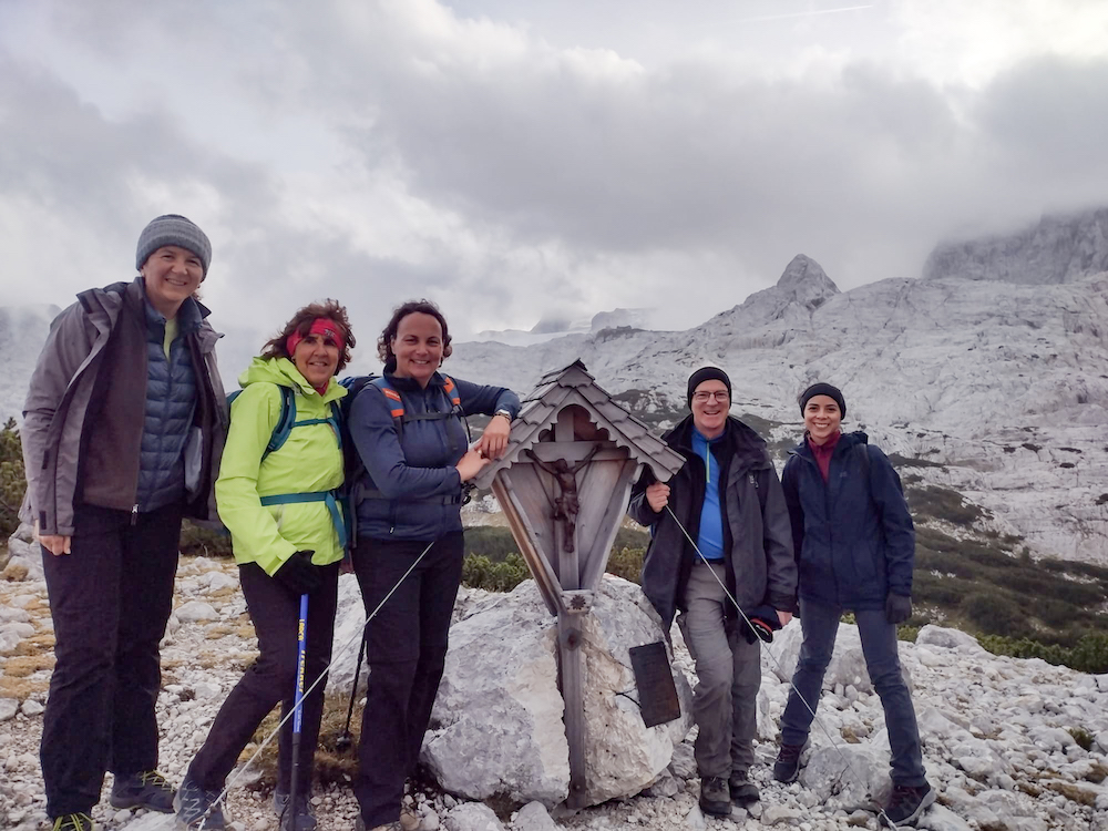 „Danke für die Aufnahme in die Gruppe. Ich habe so viele Fügungen erlebt, hatte mich schon lange nach so einer Gruppe gesucht, die in die Berge geht und betet und schöne Lieder singt. Das Gehen, auch im Nebel, hat mich dazu gebracht, zurück zu sehen auf mein Leben, wo es auch mal neblig war. Wie wertvoll ist es in solchen Lebensphasen, den Weitblick zu bewahren. So spiegelt sich auch das Leben. Ich bin so dankbar, wenn ich die Freude in mir hab. Die nette Begegnung mit der Wirtin war so schön. Ich bin auch so dankbar, dass ich nach einer schweren Rheumaerkrankung wieder in die Berge gehen kann. Die Berge sind für mich eine größere Nähe zum Himmel. Danke für jedes Lächeln und jedes Gespräch.“