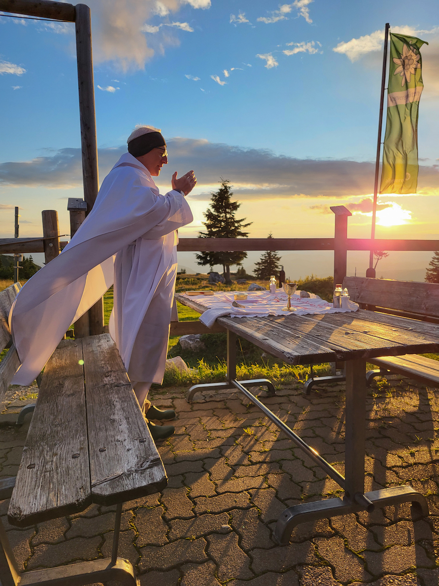 Der Aufstieg war für manche herausfordernder als gedacht – es galt 959 Höhenmeter zu überwinden –, umso größer war die Freude, das auf 1.577 m gelegene Hochleckenhaus zu erreichen. Im Licht der Abendsonne feierte P. Joachim Richter LC für die Gruppe die heilige Messe – für viele das Highlight des Tages.