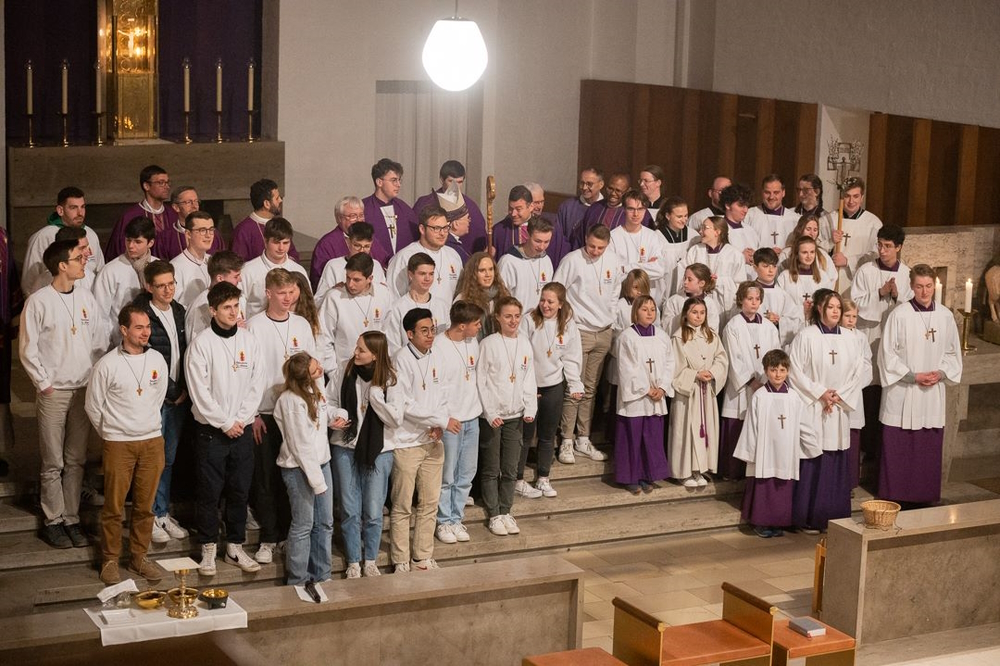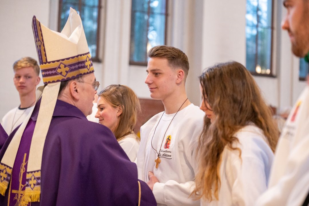 Nach der Predigt segnete Bischof Bertram die Kreuze, die er im Anschluss jedem der rund vierzig Jugendlichen als Zeichen ihrer Sendung umhängte mit den Worten: „Empfange das Kreuz Christi und sei Zeuge seiner Liebe“. Vor dem Schlusssegen verwies er noch auf die Inschrift auf seinem Bischofsstab „IHS“ mit der Bedeutung „Iesum Habemus Socium“ – auf Deutsch übersetzt: Wir haben Jesus als Begleiter. „Ich wünsche Euch, dass ihr Jesus bei den Christustagen stets als euren Begleiter habt“.