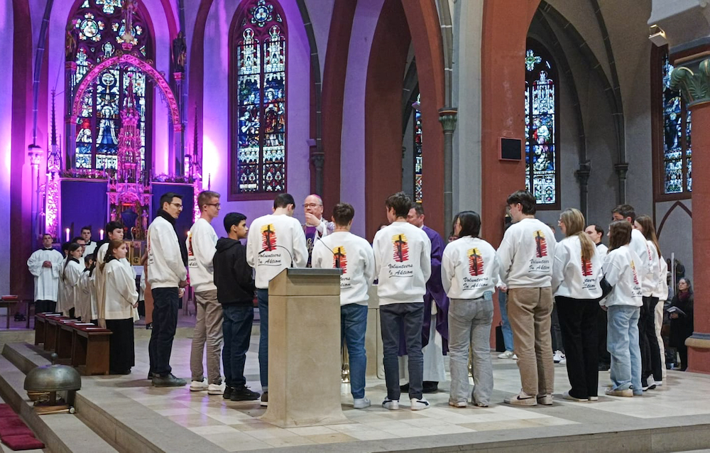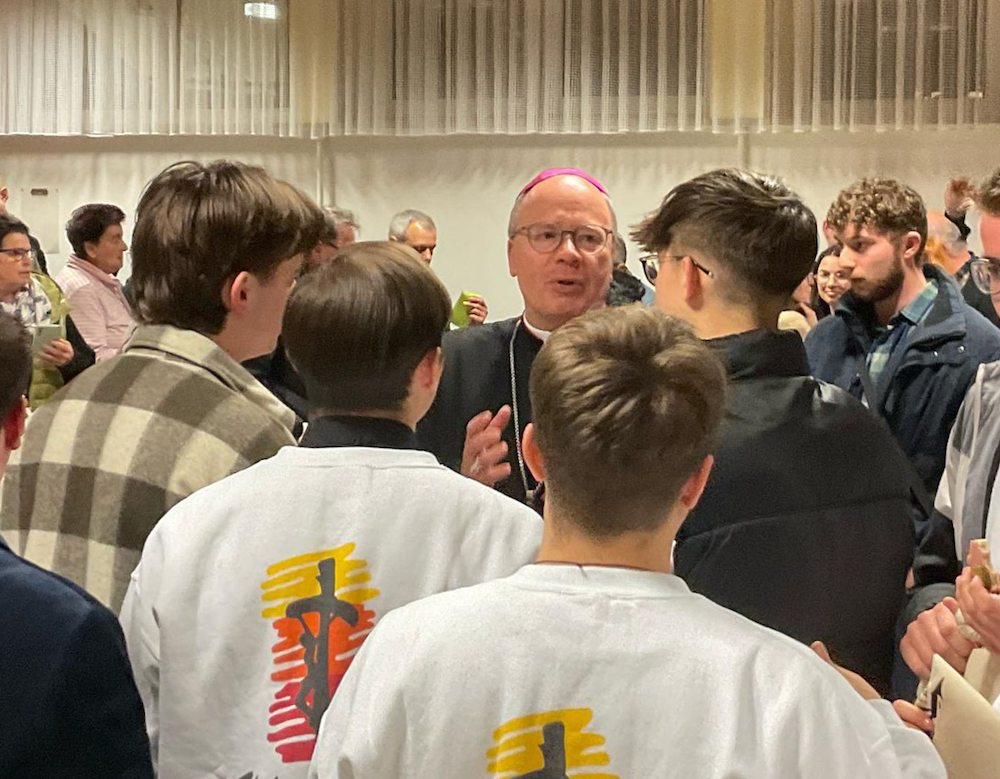 Nach der Predigt segnete Bischof Ackermann die Kreuze, die er im Anschluss jedem der Jugendlichen sowie den begleitenden Priestern als Zeichen ihrer Sendung persönlich umhängte. Nach dem Aussendungsgottesdienst verbrachte der Bischof noch über eine Stunde im Austausch mit Mitgliedern der Pfarrgemeinde, den Gastfamilien und jungen Gästen bei der Begegnung im Pfarrheim.