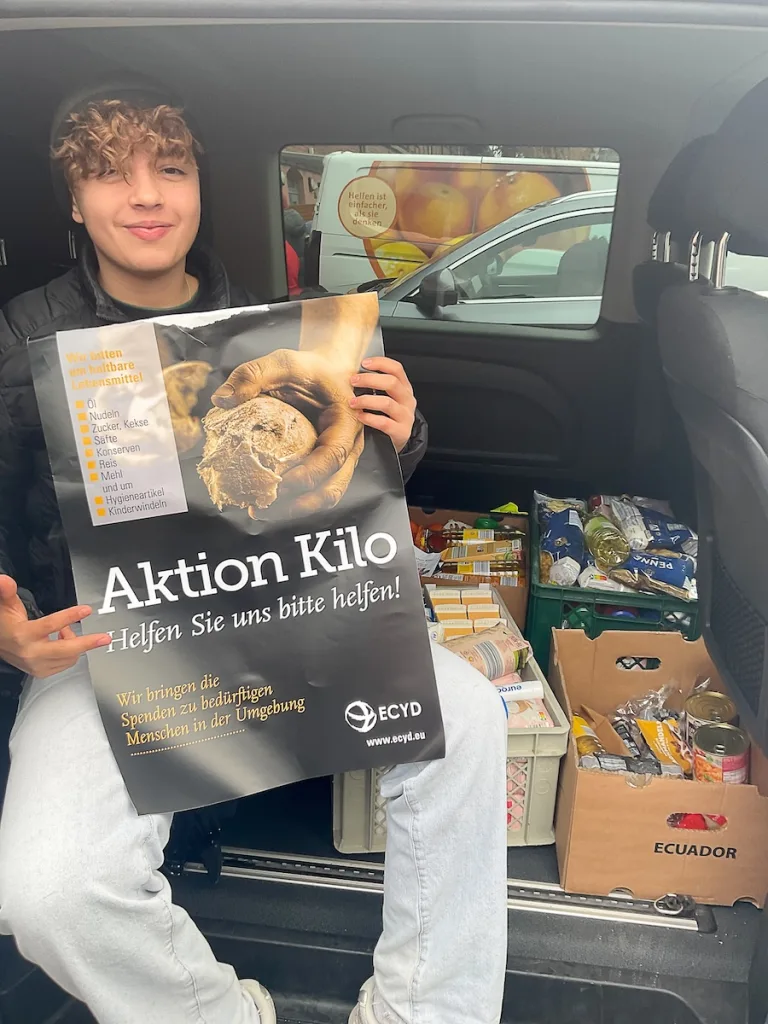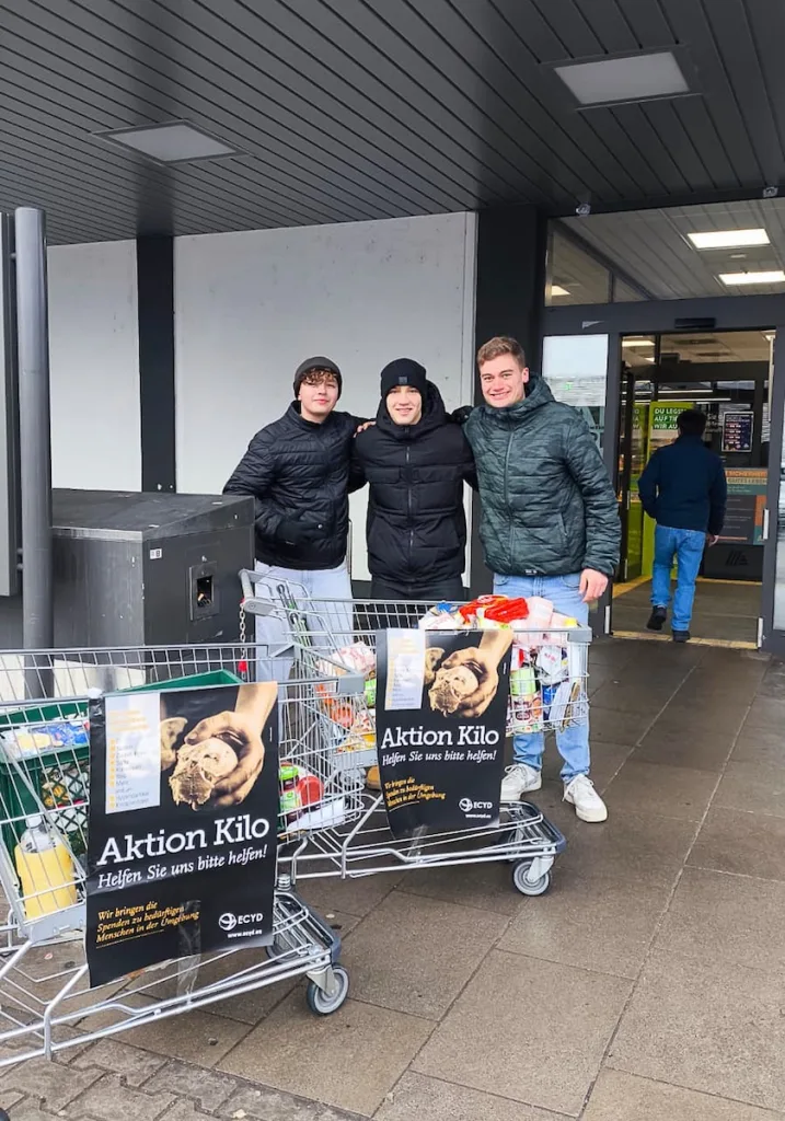 Am zweiten Adventwochenende trafen sich 18 Teilnehmer zur Aktion Kilo“ in Erlangen. Dabei baten die Jungs – aufgeteilt in Dreierteams – zwei Stunden lang die Kunden von sechs Supermärkten, ein Kilo an haltbaren Lebensmitteln mehr einzukaufen und nach der Kasse am Stand abzugeben.