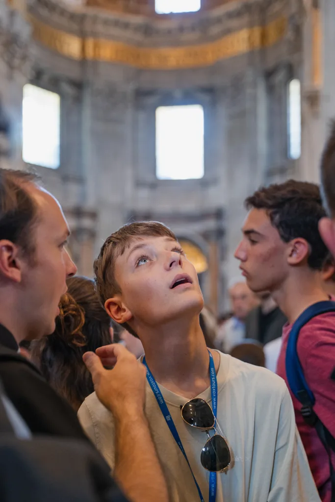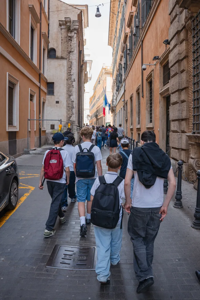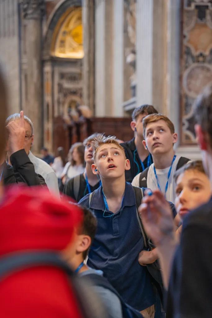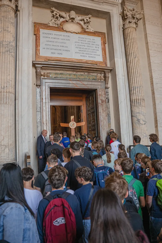 Ein weiteres Highlight war der Pilgerweg zur Heiligen Pforte. Vom Castel Sant’Angelo ging es im Gebet bis zum Grab des Apostels Petrus. Dabei trugen die Teilnehmer ein besonderes Holzkreuz mit sich als sichtbares Zeichen ihres Glaubens. Unterwegs gab es Gebet, kleine Betrachtungen und Lieder. P. Raphael erklärte den Jugendlichen: „Wenn du jetzt durch die heilige Pforte gehst, bitte Jesus um ein Geschenk, das du dir von ihm wünschst“.