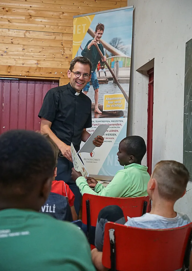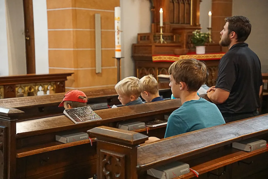 Auch im Glauben spielt Kreativität eine große Rolle. „Als Jesus wusste, dass er bald sterben würde, hatte er einen großen Wunsch: er wollte so gerne weiter bei allen Menschen sein. Wie sehr hat er sich danach gesehnt. Und da hatte er eine geniale und kreative Idee: Beim letzten Abendmahl nahm er das Brot und verwandelte es in seinen Leib. Und er nahm den Wein und verwandelte ihn in sein Blut. Den Jüngern gab er die Vollmacht, genau das weiterhin zu tun.“ Diesen Ausgangspunkt nutzte Pater Raphael, um den jungen Teilnehmern die heilige Messe näherzubringen und zu erklären. „Jesus sehnt sich nach dir! Er freut sich auf dich! Besonders in der heiligen Messe. Deswegen ist diese Zeit am Sonntag so besonders“.