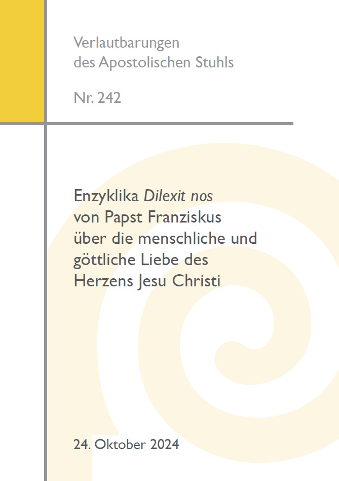 Die am 24. Oktober 2024 veröffentlichte vierte Enzyklika von Papst Franziskus mit dem Titel „Dilexit nos – Über die menschliche und göttliche Liebe des Herzens Jesu Christi“ ist nun auch als gedruckte Broschüre auf Deutsch verfügbar.