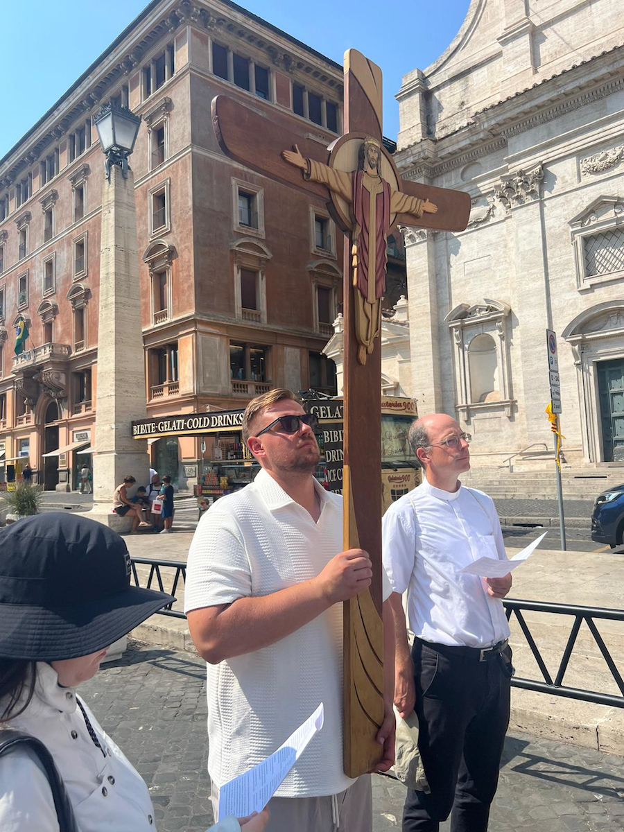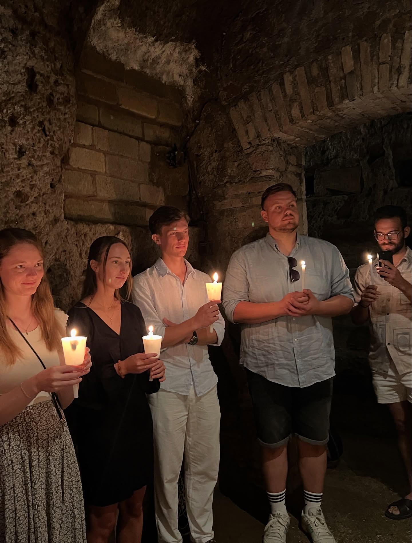 Der Blick auf das Leiden und die Erlösung prägte: Die Ausstellung des Regnum Christi zum Turiner Grabtuch, die Scala Santa und ein Kreuzweg durch die Stadt ließen die Passion Christi nicht nur historisch, sondern existenziell erscheinen. In Santa Croce, vor den Kreuzreliquien, wurde Gottes Liebe als konkret erfahrbar; in den Katakomben von San Calixto, wo schon die ersten Christinnen und Christen unter Risiko Eucharistie feierten, wurde „Treue“ zum Schlüsselwort. Marienweihe in Santa Maria in Trastevere, Gebet für die Kirche in San Crisógono, Lobpreis in Santa Cecilia – diese Stationen verbanden die große Kirche mit der persönlichen Berufung.
