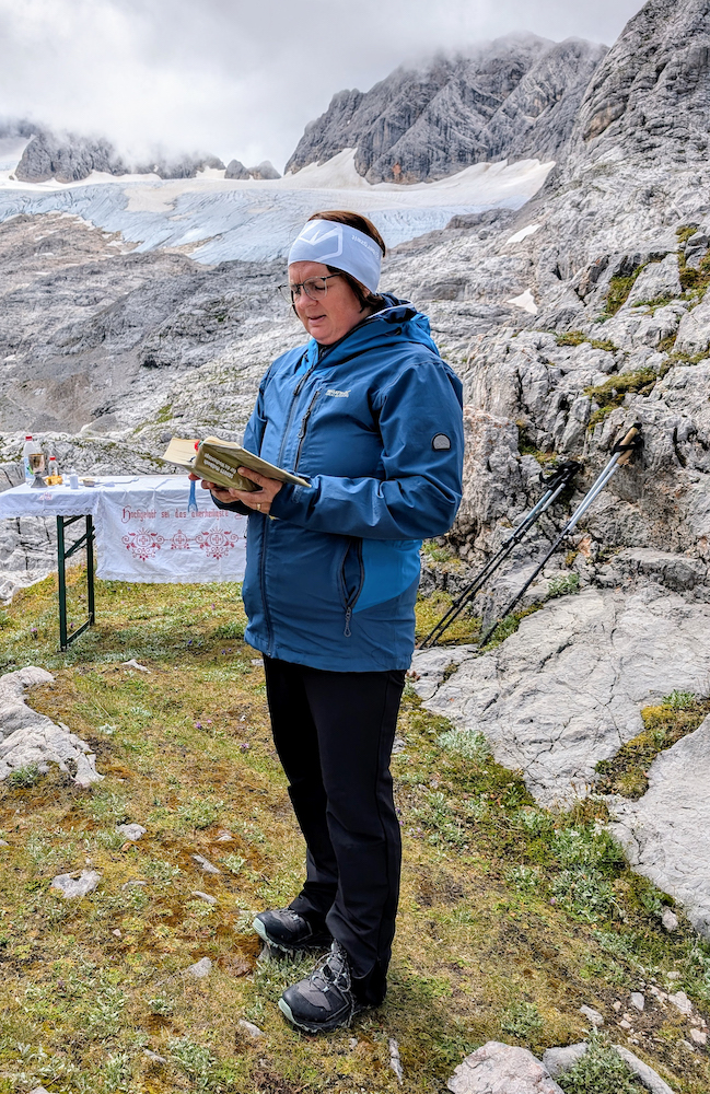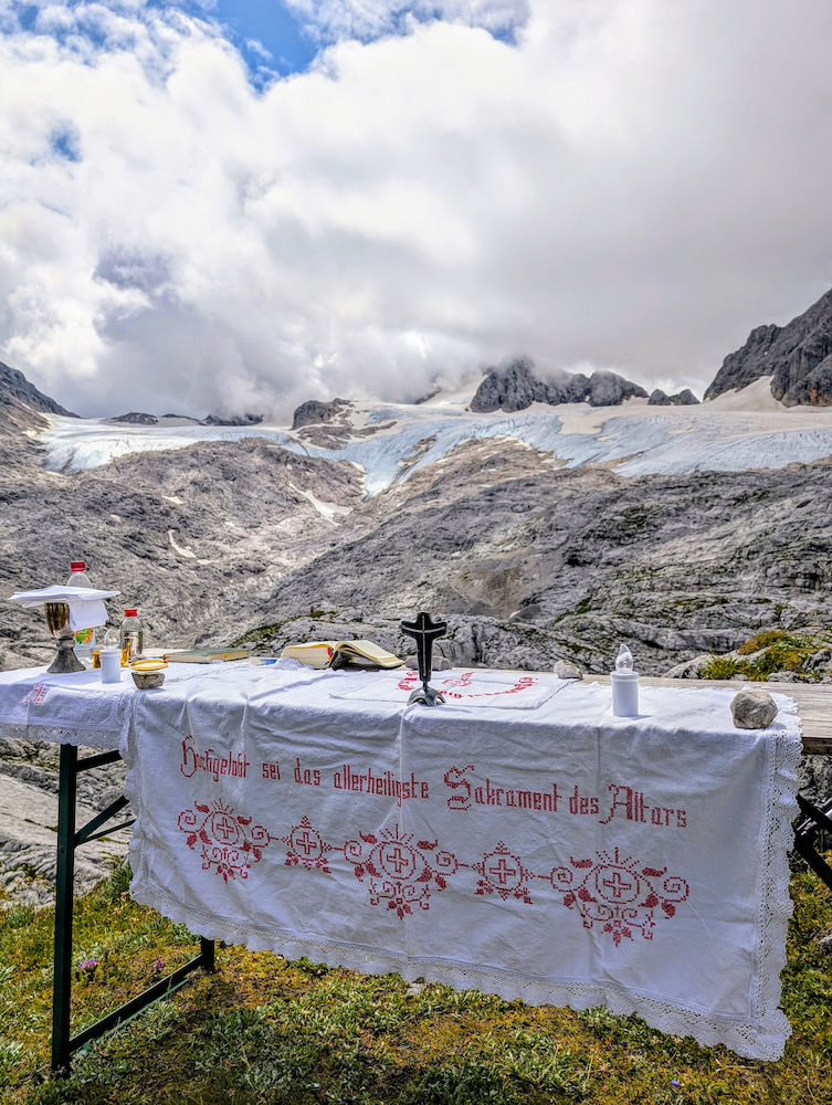 Als sie schließlich um 13 Uhr mit der Feier der Hl. Messe begannen, war das Wetter sonnig und heiter. Diese Bergmesse, vor der Kulisse des Hohen Dachstein und des darunterliegenden smaragdgrün leuchtenden Gletschers war fast zu schön, um es glauben zu können. Sie wurde zu einem unvergesslichen Erlebnis.