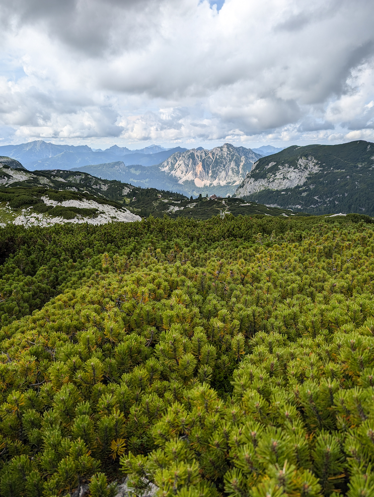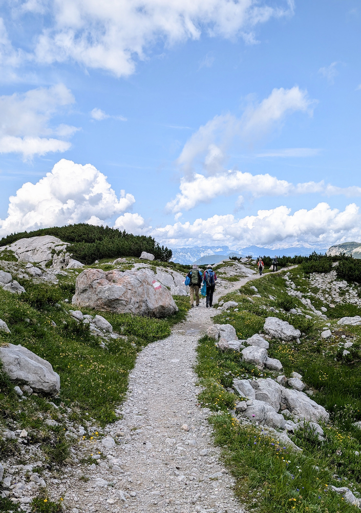 Kurz vor 10 Uhr machten sie sich auf den Weg. Der Nebel begann sich aufzulockern, die Temperatur war zum Gehen sehr angenehm. Zur Überraschung lockerten mittags die Wolken weiter auf, der Blick auf den Gletscher unterhalb des Hohen Dachsteins wurde immer freier, die sonnigen Abschnitte wurden häufiger und hielten länger an.