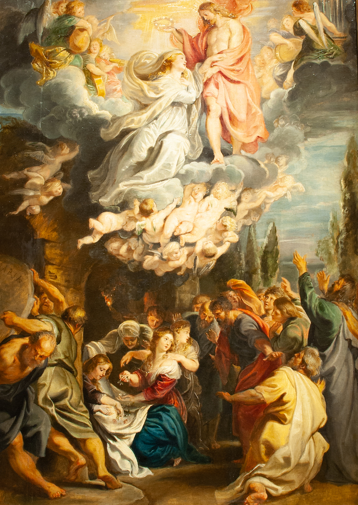 In der Offenbarung des Johannes wird uns Maria als strahlend leuchtende Person vorgestellt, die mit der Sonne bekleidet ist, während sie sich über dem Mond erhebt (vgl. Off 12). Schon die Urväter der Kirche in den ersten Jahrhunderten sahen darin Maria, die mit Leib und Seele in den Himmel aufgenommen wurde, wo sie als Königin des Himmels herrscht. Der katholische Glaube besagt, dass wir unseren auferstandenen und verklärten Leib nicht direkt wieder erlangen, wenn wir sterben. Vielmehr warten wir auf die Auferstehung unseres Leibes am Letzten Tag, obwohl wir bis dahin schon in den Freuden des Himmels leben. Maria jedoch, wie Jesus auch, lebt schon jetzt in diesem Stand der Fülle, in dem die Geretteten nach dem Ende dieses Himmels und dieser Erde leben werden. Sie, die in den Himmel Aufgenommene, ist ein Vorausschau für uns alle am Ende der Zeiten.