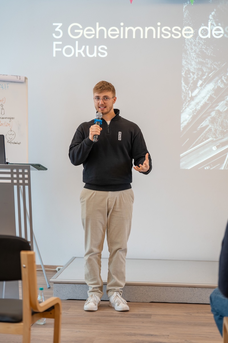 Weitere Impulse zum Thema kamen aus dem Buch „Die Kraft eines fokussierten Lebens“ von Dr. Johannes Hartl, das Teamleiter Maximilian Zeltsperger vorstellte. Er brachte den Gedanken mit einem einprägsamen Bild auf den Punkt: „Ohne Fokus zu leben ist wie ein Fußballspiel ohne Tore. Sich zu fokussieren kostet zuerst Kraft. Aber dann wächst man durch den Fokus.“