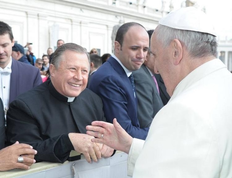 Papst Franziskus grüßt während einer Generalaudienz 2014 auf dem Petersplatz den neu gewählten Generaldirektor der Legionäre Christi, P. Eduardo Robles Gil LC. In diesem Jahr approbierte der Heilige Stuhl auch die neuen Konstitutionen (Ordensregeln) der Legionäre Christi.