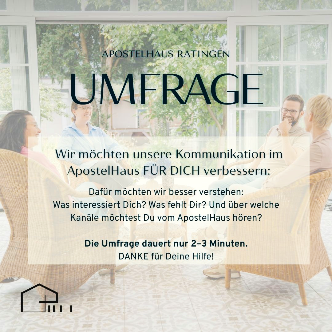 Deshalb laden wir herzlich ein, an einer kurzen Online-Umfrage teilzunehmen. Sie dauert nur etwa zwei bis drei Minuten und hilft uns, unsere Kommunikation weiterzuentwickeln und noch besser auf die Bedürfnisse der Menschen einzugehen, die mit dem ApostelHaus verbunden sind oder es neu entdecken.