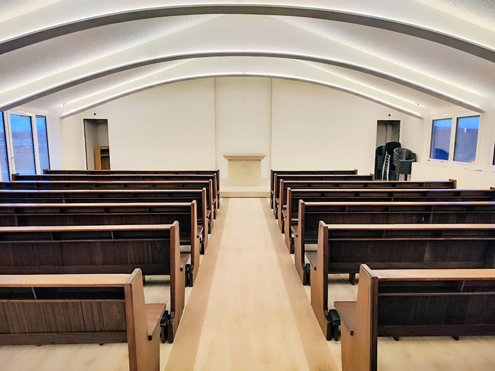 P. Joachim: Der Raum war schon vorhanden und diente in der ehemaligen Hotelfachschule als Prüfungsraum. Wir haben zunächst das Dach wärmeisoliert, Lecks in der Fußbodenheizung repariert und anschließend den Altarraum, die Decke und den Boden gestaltet.