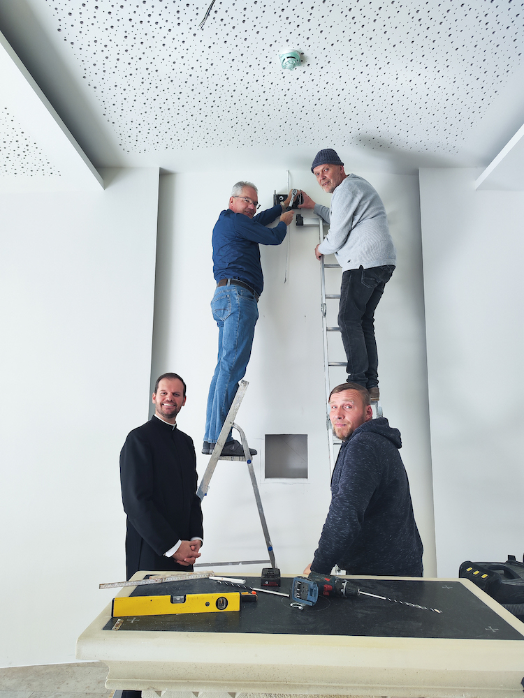 Besonders froh sind wir über eine gute Beleuchtung: LED-Streifen, die indirektes Licht erzeugen; und über die Tonanlage, die besonders bei Gebetszeiten und liturgischen Feiern mit Jugendlichen und Familien wichtig ist. Ton und Licht sind über Tablet steuerbar und damit gut auf den jeweiligen Bedarf anpassbar.