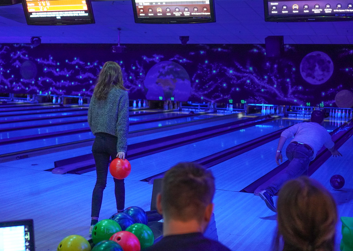 Am Samstag ging es erst zum Mittagessen, dann zum Bowling Planet Düsseldorf – mit Darts, Bowling und Pixel Game. Abends gab’s Cocktails und Spiele bis spät in die Nacht.